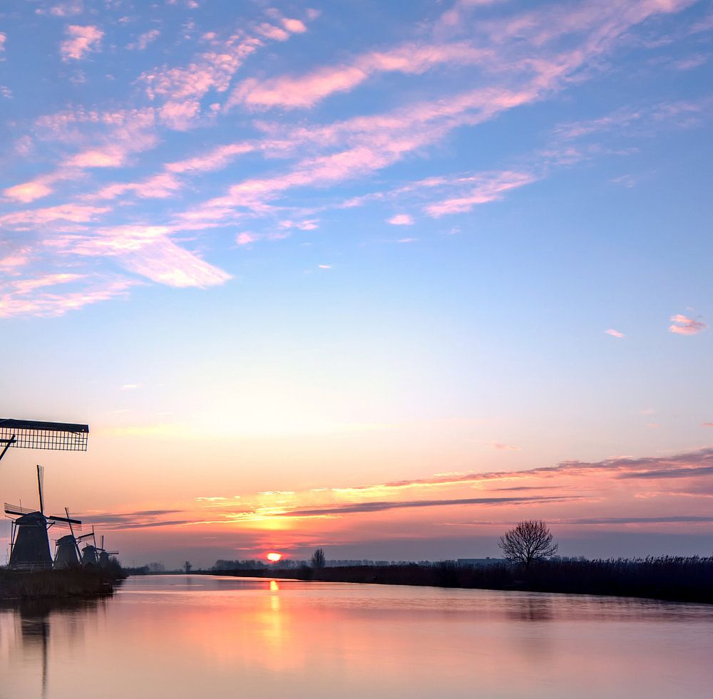 Nach einer Nacht mit Temperaturen unter null Grad Celsius geht in Kinderdijk in den Niederlanden die Sonne auf.