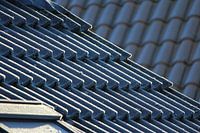 Mit Reif bedeckte Dachziegel, die im Winter von der frühen Morgensonne beleuchtet werden. Interessante lineare und zickzackförmige Muster bilden