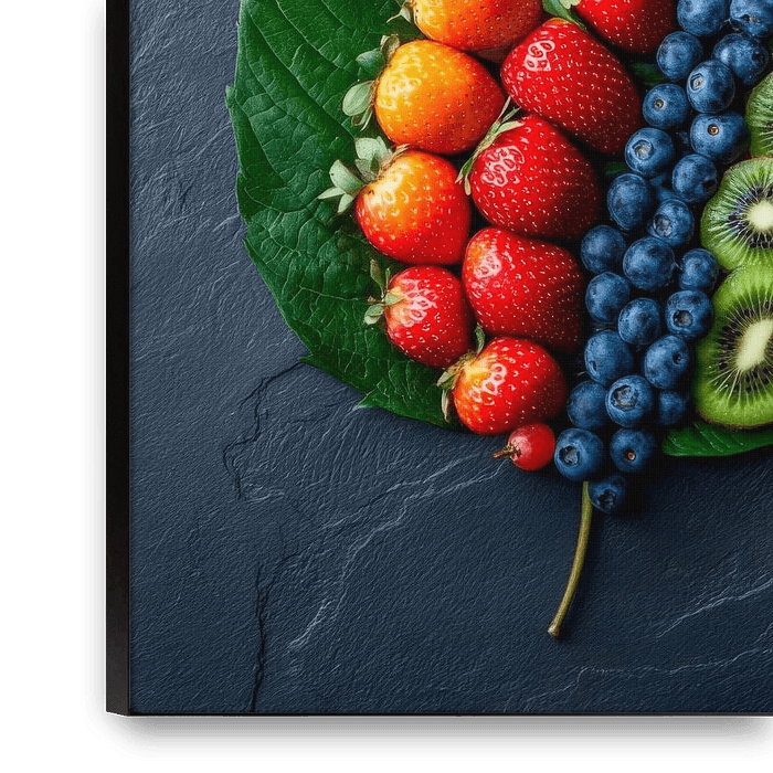 Farbenfrohe Früchte machen diesen rustikalen Blatt-Hintergrund zum Highlight! Saftige Erdbeeren und knackige Trauben harmonieren perfekt mit dem kräftigen Grün der Blätter. Diese Komposition einlädt die Frische der Natur in jede Küche und bringt eine lebendige, gesunde Atmosphäre, die zum Snacken und Genießen verführt. Ideal für…