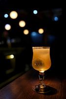 Fruchtiger Cocktail auf einem Holztisch mit Lichtern im Hintergrund
