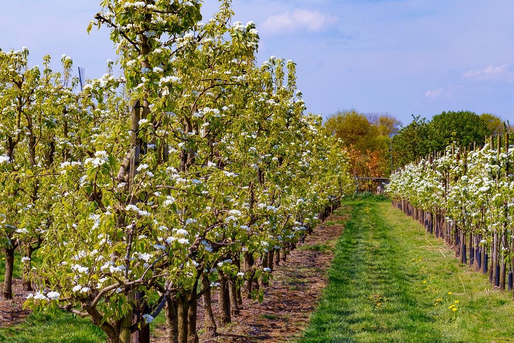 Frühling im Obstgarten mit alten Apfelbäumen auf einer Wiese und Kühen im fernen Hintergrund.