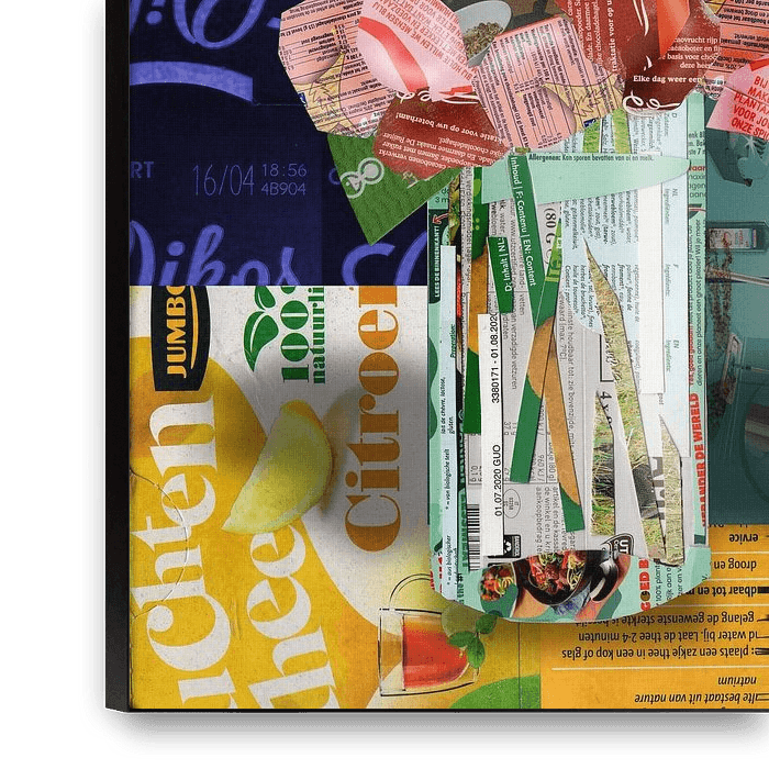 Die umweltfreundlichste Lackierung, ohne den Einsatz von Farbe. Ausschließlich aus Abfall hergestellt. Fetzen von Verpackungskarton kombiniert in einer Collage, die größtenteils digital erstellt wird.