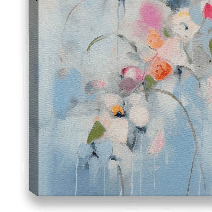 Abstraktes Gemälde in sanften Pastelltönen mit fröhlichen kleinen Frühlingsblumen.
