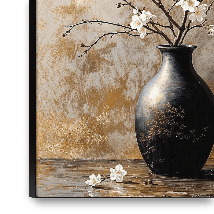 Dieses ruhige Stillleben zeigt die vorübergehende Schönheit von Frühlingsblüten, arrangiert in einer dunklen Vase vor einem Hintergrund aus dezenten Farbtönen. Die rissigen Zweige strahlen eine zerbrechliche, aber unverwechselbare Kraft aus, eine symbolische Darstellung des Kreislaufs des Lebens und der Vergänglichkeit. Die gerahmte…