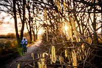 Radfahrer auf Fahrradweg in der Einstellungsabendsonne in einem Wald. Die Quelle gibt ihre ersten Blüten mit einer Nahaufnahme eines Haselnussbuschs ab. Atmosphärisches Foto eines schönen saisonalen Abends