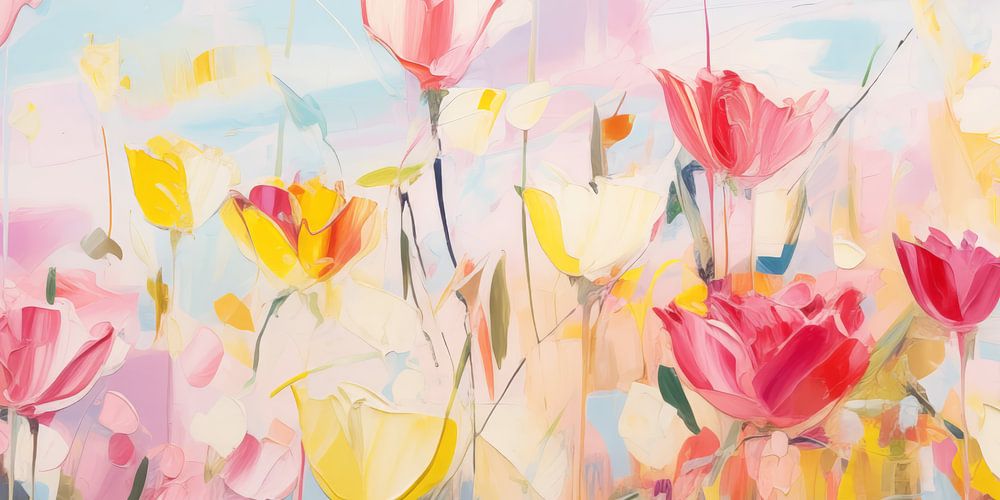 Spring Blossom Dance" ist eine lebendige digitale Ode an den Frühling, die die Energie und Erneuerung der Jahreszeit zum Leben erweckt. Eine bunte Truppe von Tulpen wiegt sich sanft in der unsichtbaren Frühlingsbrise, wobei die Schattierungen von Rosa, Rot und Gelb einen auffälligen Kontrast zum sanften blauen Himmel bilden.
