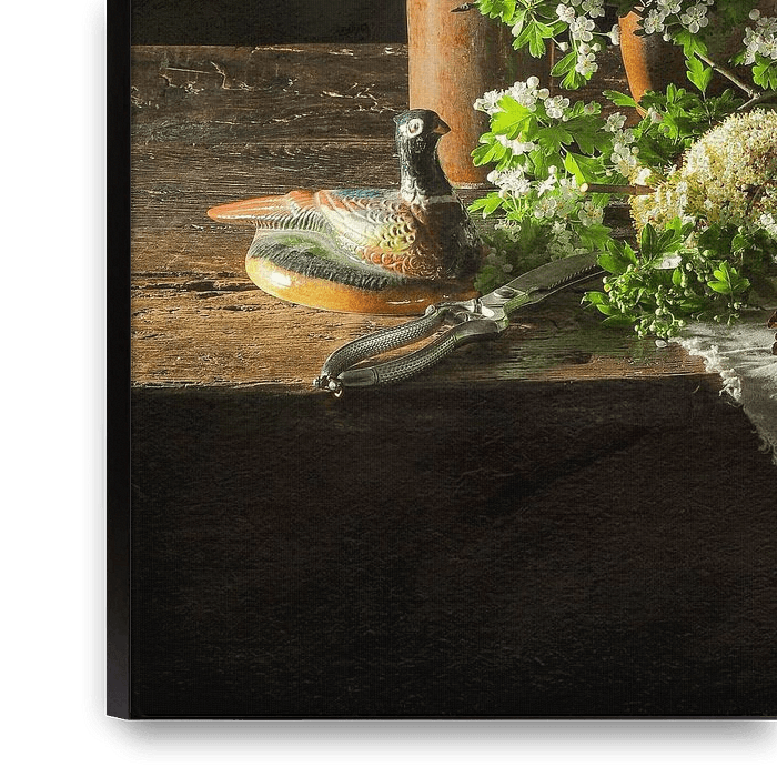 Ein Stillleben im Stil eines alten Ölgemäldes. Viburnum, rosa Flieder und Weißdorn als frisch gepflückter Strauß auf einem alten Holztisch. Mit einem Steingutkrug aus dem frühen 20. Jahrhundert, einem Krug aus Brokatkeramik, einer alten Schere und einer alten Fasanenfigur. Vor einem dunklen Hintergrund.