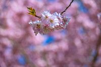Zartrosa Kirschblüten wiegen sich an einem filigranen Zweig im sanften Frühlingswind, während die ersten grünen Knospen den endgültigen Abschied vom Winter verkünden. Das weiche Licht betont die hauchdünnen Blütenblätter, die sich in ihrer vollen Pracht gegen einen tiefblauen Himmel und einen malerisch verschwommenen Hintergrund…