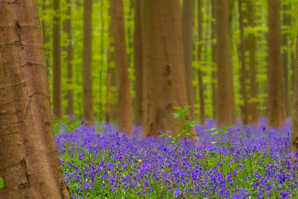 Im Frühling verwandelt sich der Hallerbos-Wald in Belgien in eine magische, fast unwirkliche Szenerie, wenn Millionen von Blauglockenblumen auf dem Waldboden blühen. Diese zarten Blüten bilden einen dichten, violettblauen Teppich, der sich zwischen den hohen, schlanken Stämmen der alten Buchen ausbreitet, so weit das Auge reicht.