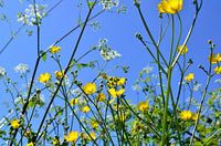 Dieses Foto habe ich letztes Jahr während eines Spaziergangs im Frühling aufgenommen. Aus einer niedrigen Perspektive habe ich die Wildblumen vor dem blauen Himmel fotografiert. Gelbe Butterblumen und weißer Wiesenkerbel vor einem strahlend blauen Himmel. Frühling auf dem Land.