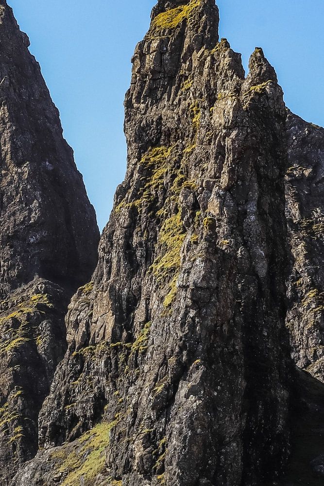 Dieser Druck zeigt den Old Man of Storr auf der Isle of Skye, aufgenommen an einem strahlenden Frühlingstag. Die imposante Felsformation erhebt sich majestätisch gegen den klaren blauen Himmel, während die Sonne weiche Schatten auf den grünlich-gelben Hang am Fuße des Berges wirft. Im Frühling färbt frisches Gras die Flanken und bildet einen lebhaften Kontrast zu dem graubraunen Felsen, während der Himmel wolkenfrei ist.