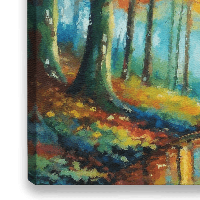 Ein farbenfrohes, digital gemaltes Werk über einen schönen Ort im Wald mit einem Bach.
