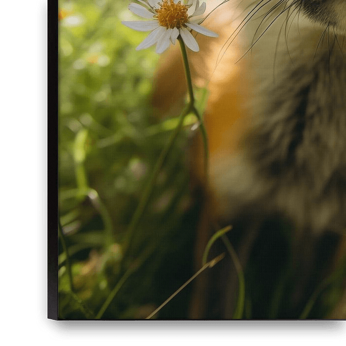 Ein imposanter Fuchs inmitten einer wundervollen Blumenwiese. Die Sonne scheint im Hintergrund und verleiht dem Bild eine tolle Atmosphäre. Der Fuchs blickt direkt in Richtung des Betrachters und scheint zum Greifen nah zu sein.