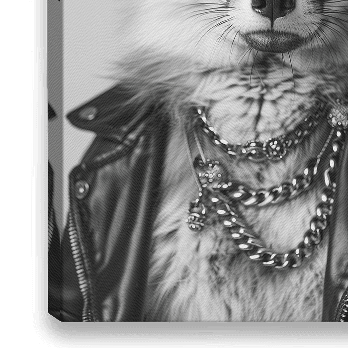 Schwarz-Weiß-Porträt eines Fuchses in modischer Lederjacke und Hut, geschmückt mit einer Halskette und runden Brillen. Perfekte Mischung aus Tierwelt und menschlicher Mode.