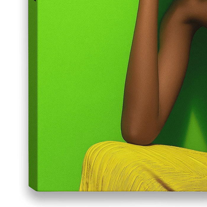 In Fusion Golden spielt das kräftige Gelb des Outfits des Models die Hauptrolle, unterstützt von einem Hintergrund in warmen Grüntönen, der der Komposition ein ausgewogenes und energiegeladenes Aussehen verleiht. Das Modell strahlt Eleganz und Selbstvertrauen aus, während das Licht behutsam über ihre Haut und Kleidung fällt und ein…