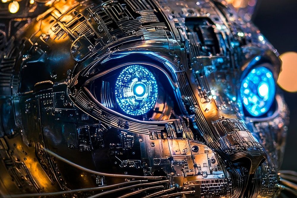 Ein faszinierendes Meisterwerk, das die Verbindung zwischen Technologie und Tierwelt verkörpert. Die strahlend blauen Augen und das metallische Fell verleihen der skulpturalen Katze eine mystische Aura. Ideal für das Wohnzimmer, wo sie Gespräche anregen und als modernes Kunststück bestimmt nicht unbemerkt bleibt. Ein Highlight für jeden Designliebhaber!