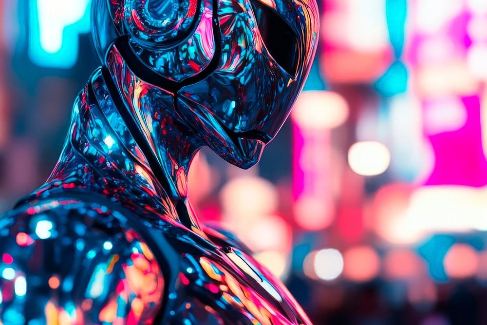 Inmitten einer pulsierenden Stadtlandschaft strahlt eine futuristische Figur in schimmerndem Chrom, umgeben von leuchtenden Neonlichtern. Diese Mischung aus Mensch und Maschine verkörpert Innovation und Kreativität. Ideal für ein modernes Wohnzimmer, verwandelt es den Raum in einen Ort voller Inspiration und futuristischer Energie.