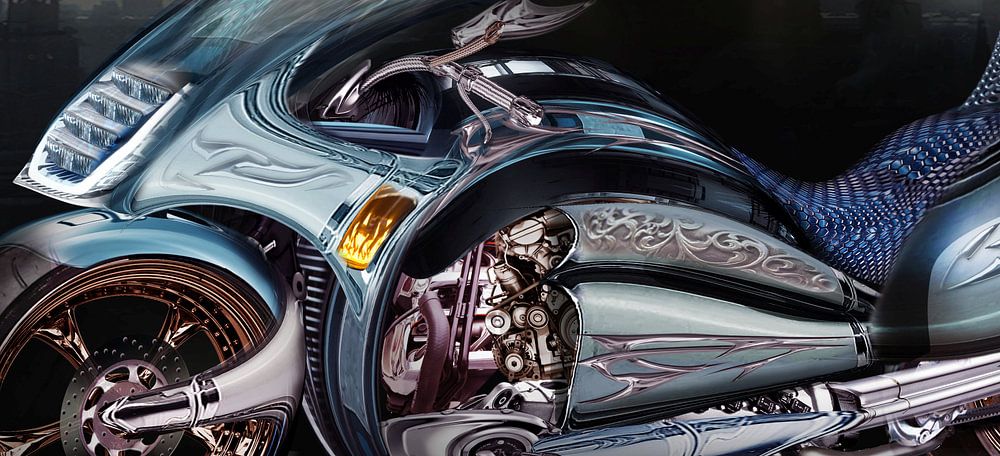 Dieser Reisemotor, Cruiser oder ernsthaftes Tourengehen entspringt der Phantasie des Künstlers, der hier ein Benzin schluckendes Motorrad platziert.