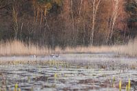 Landschaft auf dem Gut Kleine Bylaer in Barneveld, mit Gänsen auf dem Wasser, im goldenen Licht des frühen Morgens.
