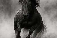 Ein schwarzes Pferd stürmt direkt auf Sie zu, die Mähne weht und die Beine sind angespannt, während eine dichte Staubwolke den Hintergrund verschwimmen lässt. Die kraftvolle Silhouette hebt sich deutlich von den sanften Grautönen ab, was einen intensiven Kontrast und ein filmisches Gefühl vermittelt. Klare Linien der Muskeln und das…