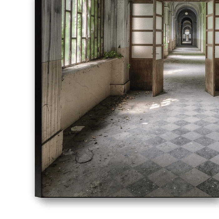 Dieser sehr beeindruckende Korridor ist Teil eines verlassenen Krankenhauses. In den Zeiten, als nicht nur Funktionalität gedacht wurde.