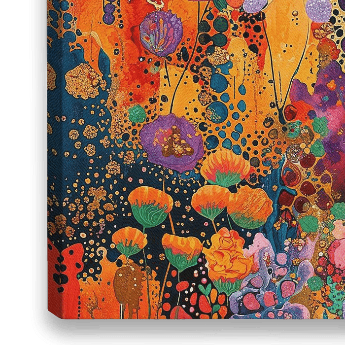 Garden Delight Abstrakt - Dieses abstrakte Gemälde zeigt eine lebhafte Explosion von Farben und Formen, die an einen Blumengarten erinnern, mit goldenen Sprenkeln, die dem Bild einen strukturierten und dynamischen Aspekt verleihen.