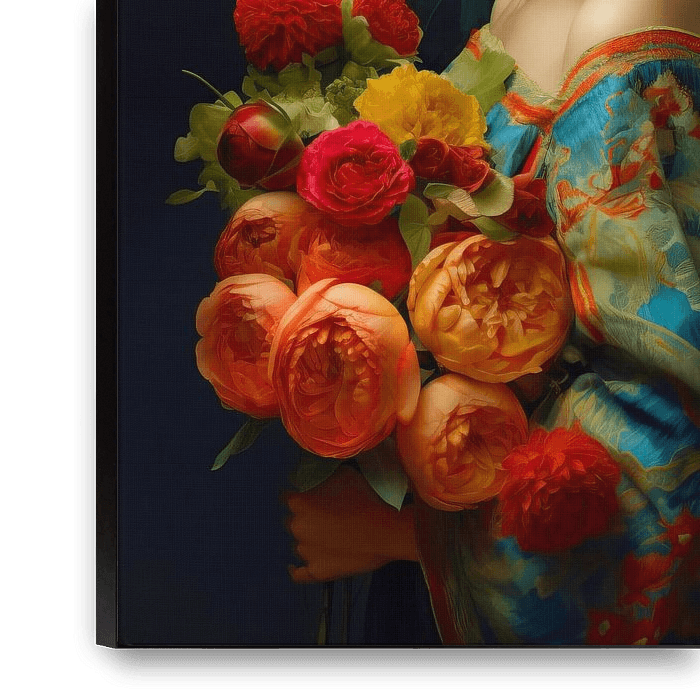 Inmitten eines märchenhaften Gartens entführt uns das Bild in eine orientalisch inspirierte Blumenwelt. Eine faszinierende Frau steht im Zentrum der Szene, ihre Gestalt ist kunstvoll mit einer schillernden Fülle von lebendigen Blumen bedeckt. Die Farben sind so intensiv, dass sie beinahe lebendig wirken.