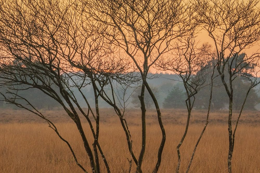 Auf dem Speulder- und Houtdorperveld bei Gaderen sieht es mit dem gelb-orangefarbenen Gras und einigen einzelnen Bäumen ein wenig aus wie eine afrikanische Savanne im Herbst.