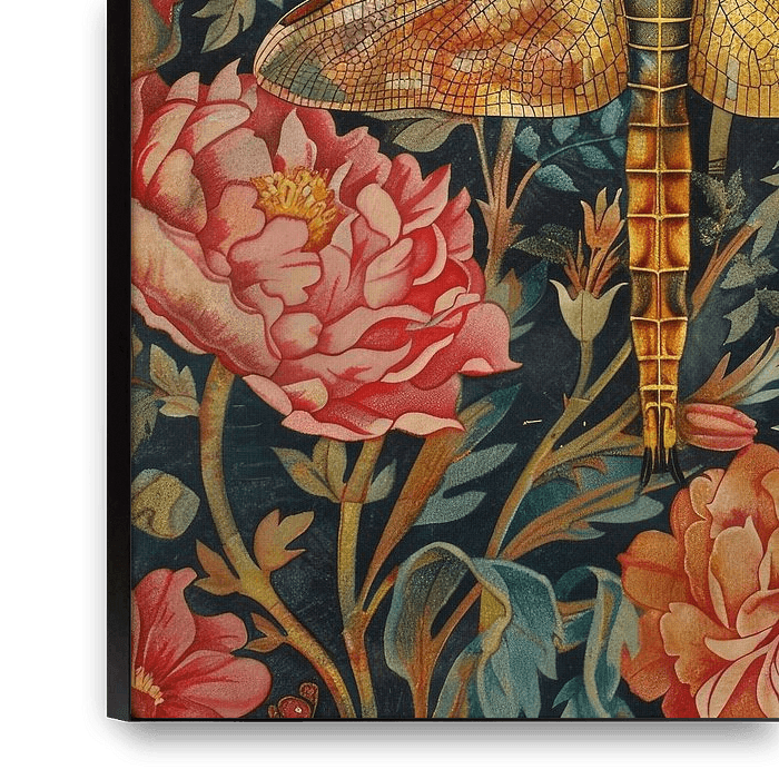 Dieses künstlerische, schöne Kunstwerk ist eine detaillierte Darstellung einer Libelle, die kunstvoll auf einem Hintergrund aus üppigen Blumen dargestellt ist.