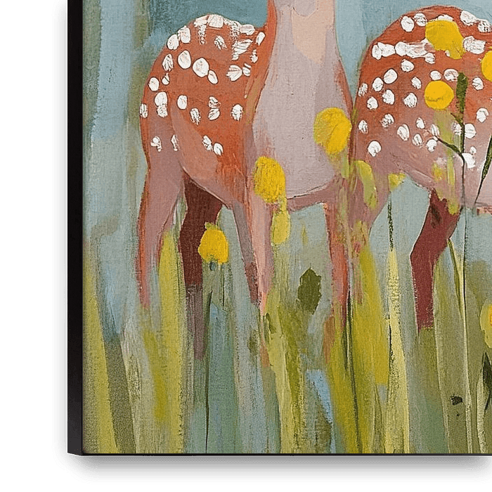 Garden Deer | Five Deer in Garden - Dieses Gemälde zeigt fünf niedliche junge Rehe, die fröhlich in einem blühenden grünen Garten stehen, umgeben von gelben Blumen, mit einem weichen Hintergrund aus Blau und Grün.
