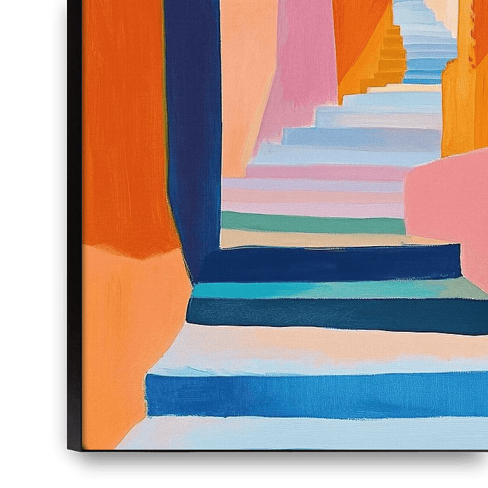 Garten Treppe | Garten Treppe - In diesem farbenfrohen Gemälde sehen Sie einen sonnigen Garten mit einer Treppe zwischen auffälligen Pastellfarben wie Rosa, Orange und Blau, wo Palmen und grüne Pflanzen den Raum fröhlich gestalten.