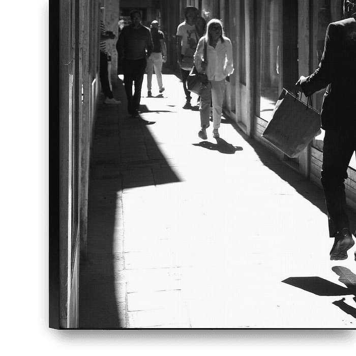 Diese Fotografie führt den Betrachter tief in eine der schmalen venezianischen Gassen, in der das einfallende Licht eine fast bühnenhafte Szenerie erschafft. Zu sehen ist eine Momentaufnahme des Alltags: Menschen bewegen sich durch den Raum, doch durch die harten Kontraste und die vertikale Linienführung der hohen Hauswände wirkt die…