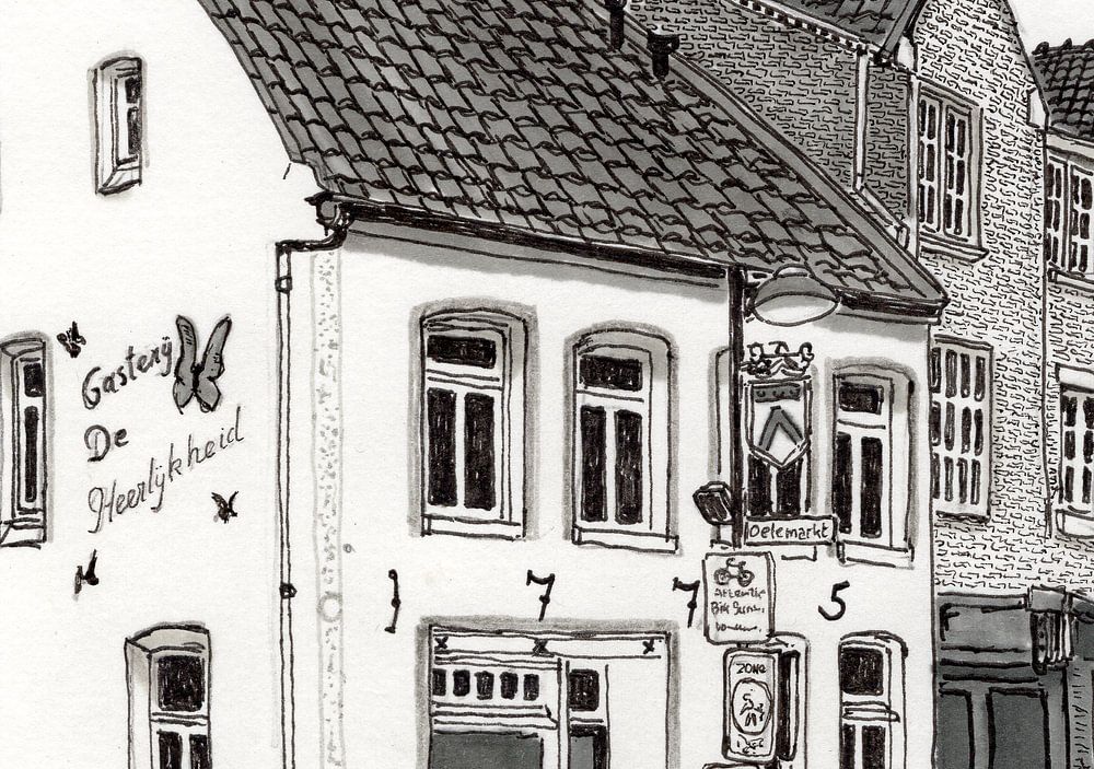 Federzeichnung: Fineliner und Marker Originalgröße a5 ( 14,8 x 21 cm ) An der Ecke des Oelemarkts in Weert befindet sich dieses Restaurant in einem historischen Gebäude.