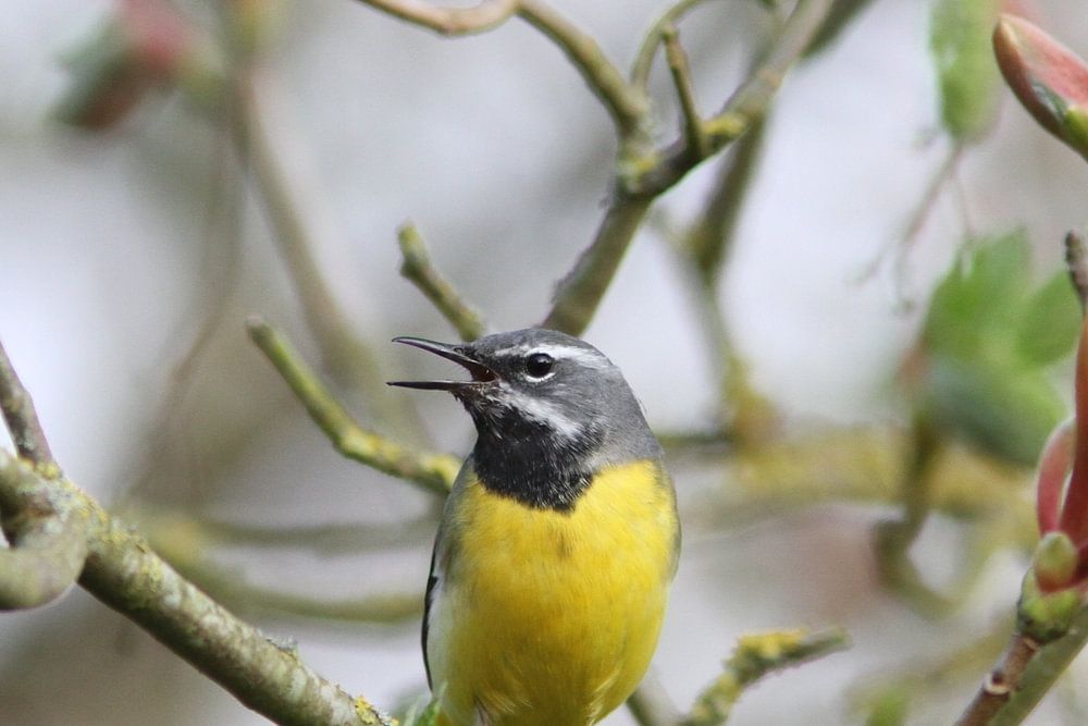 Diese große gelbe Bachstelze hatte ein Nest mit 3 Jungen. Alle drei wurden schnell flügge. Auf dem Foto ist das Elternteil aufmerksam und sucht nach Nahrung.