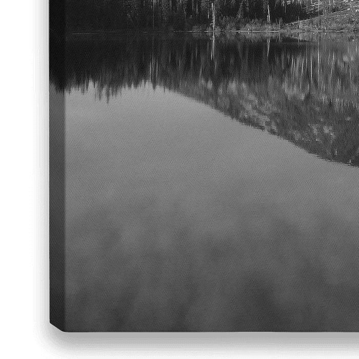 Schwarz-Weiß-Fotografie der Spiegelung der Grand-Teton-Bergkette am Jenny Lake im Grand-Teton-Nationalpark in der nordwestlichen Region von Wyoming in den Vereinigten Staaten. Südlich des Yellowstone-Nationalparks. Eine beeindruckende Bergregion, die zu den Rocky Mountains gehört. Im darunter liegenden Tal von Jackson Hole gibt es…