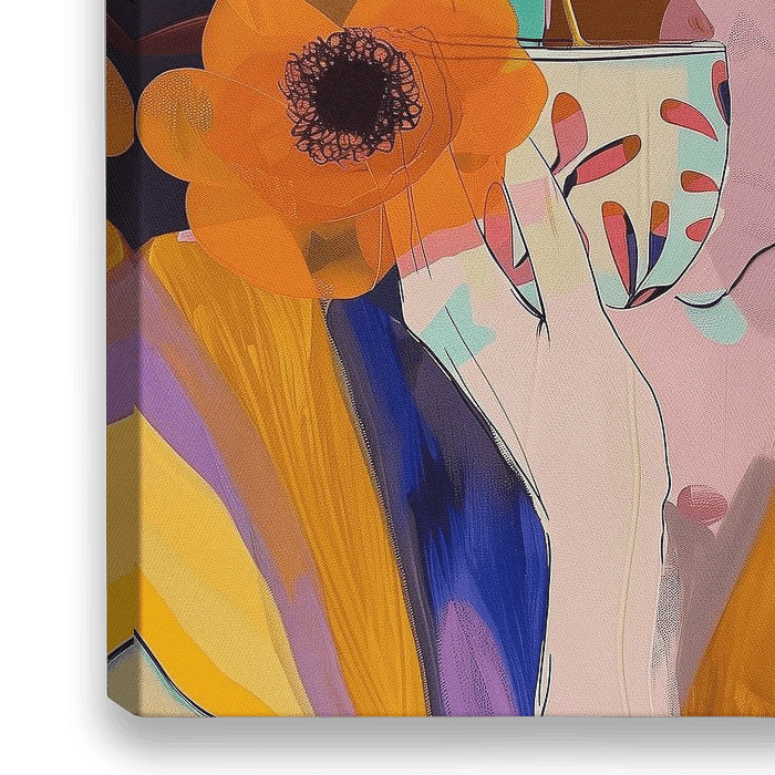 Buntes Bild einer Frau, die gedankenverloren ihre Tasse Kaffee genießt. Die Szene wird durch schöne Blumen ergänzt. Das Bild springt durch die Lebendigkeit der Farben von der Leinwand. Schönes abstraktes Design in verschiedenen Bereichen mit Farben und dünnen Linien. Das Farbschema ist rot, lila, grün, rosa, gelb und orange mit dünnen…
