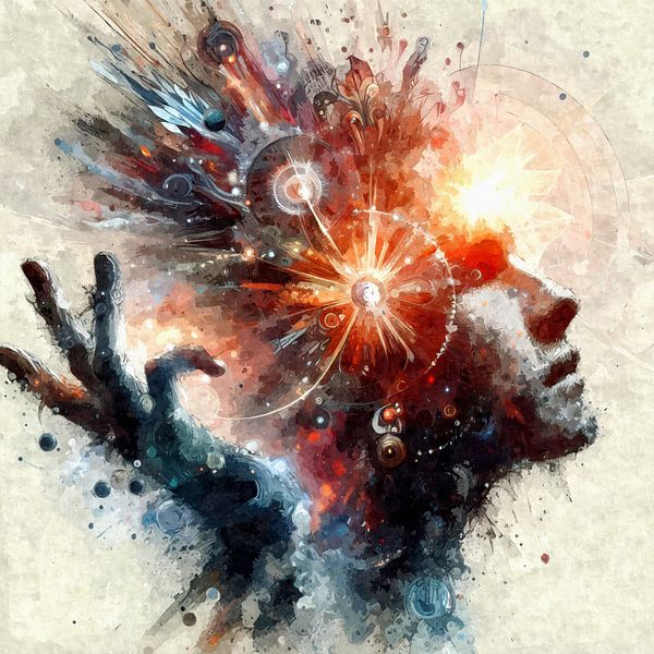 Dieses dynamische Kunstwerk zeigt ein menschliches Profil, aus dem kraftvolle Strahlen, Farben und Muster hervorbrechen. Die Komposition symbolisiert Kreativität, Bewusstsein und geistige Energie. Intensive Blau‑, Rot‑ und Orangetöne verschmelzen mit abstrakten Formen, die an Licht, neuronale Verbindungen oder kosmische Impulse…