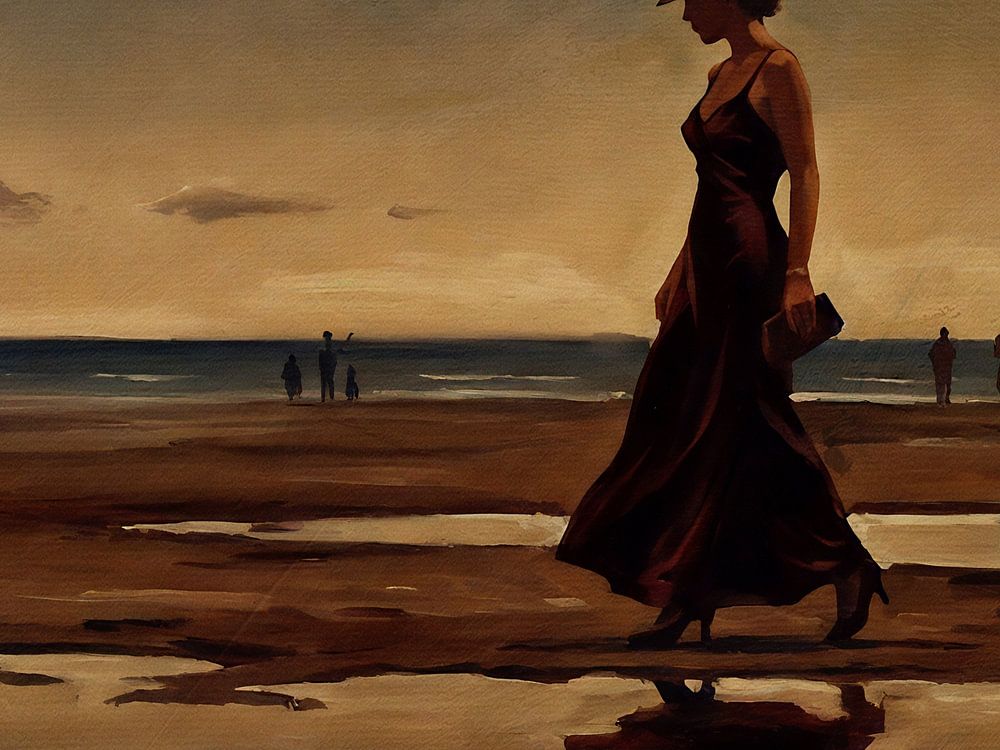 Dieses Gemälde fängt einen flüchtigen Moment der Introspektion und Einsamkeit ein, vor dem Hintergrund der Weite eines Strandes zur goldenen Stunde. Die Pinselstriche des Künstlers vermitteln eine tiefe Verbundenheit mit dem Wechselspiel von Licht und Reflexion, in dem der nasse Sand die warmen Farbtöne des Himmels widerspiegelt und…