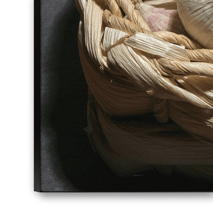 Geflochtener Korb mit frischen Knoblauchzwiebeln.