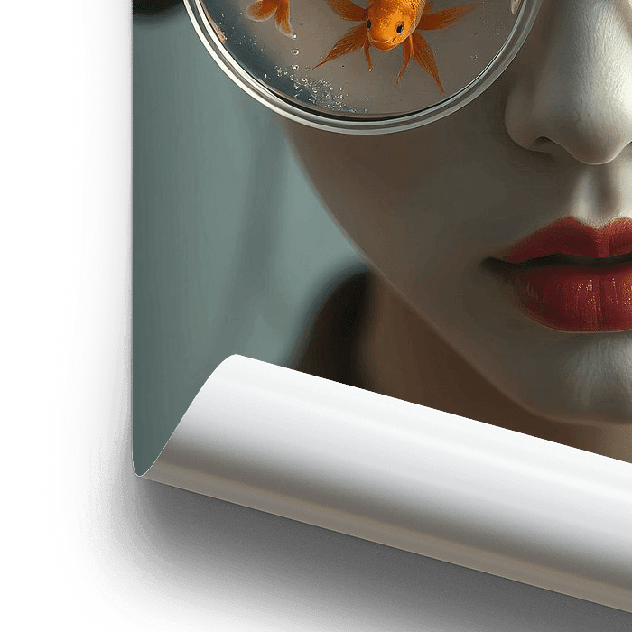 Treten Sie ein in eine Traumwelt, in der Tradition und Fantasie aufeinandertreffen. Dieses surrealistische Gemälde zeigt eine japanische Geisha mit einer geheimnisvollen Gelassenheit. Was sofort ins Auge fällt, ist ihre gigantische Brille, die wie ein Mini-Aquarium wirkt. In jedem Glas schwimmen zwei lebhafte Goldfische, die mit fast fotografischer Präzision detailliert gemalt sind. Winzige Blasen und grünliche Pflanzen am Boden der Gläser verstärken das Gefühl, dass man tatsächlich in eine Unterwasserwelt blickt.