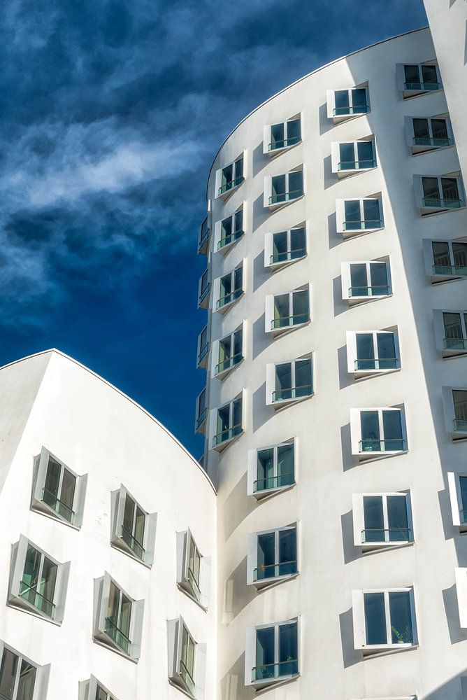 Gehry-Bauten im Medienhafen Neuer Zollhof in Düsseldorf mit Himmel