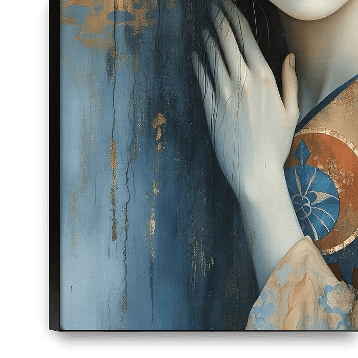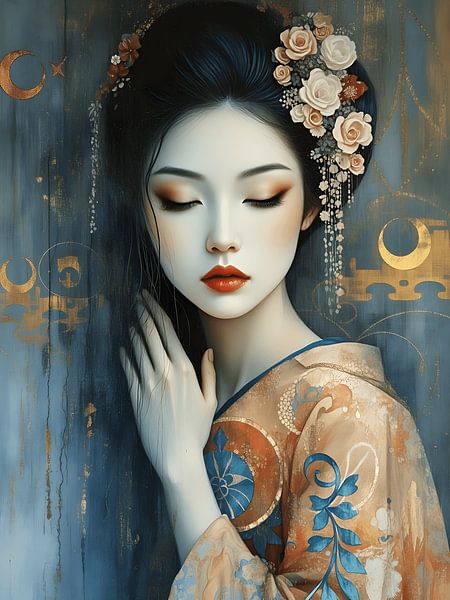 Dieses Gemälde stellt eine Geisha dar: eine Ikone der japanischen Kultur, die Disziplin, Schönheit und Meisterschaft vereint. Im Profil, mit geschlossenen Augen und ruhiger Miene verkörpert sie schlichte Eleganz. Ihre Porzellanhaut, die sorgfältig gestylte Frisur und das raffinierte Make-up verweisen direkt…