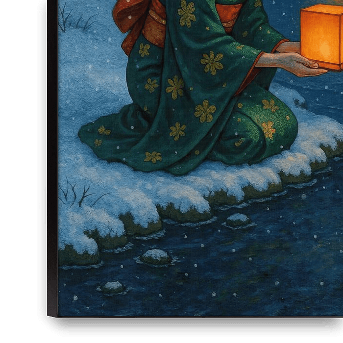 In dieser bezaubernden Winterlandschaft kniet eine japanische Geisha in einem grünen Kimono mit goldenem Blumenmuster am Rande eines verschneiten Flusses. In ihren Händen hält sie eine warme, orange leuchtende Laterne. Eine von vielen, die langsam über das dunkle Wasser hinweg treiben. Schneeflocken wirbeln sanft herab, während in der…