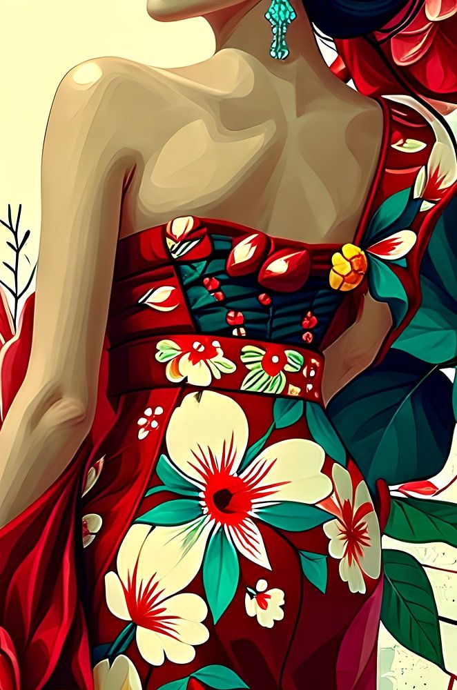 Malerisches Foto einer fiktiven sinnlichen orientalischen Geisha-Frau mit Blumen. Feine Details und helle, lebendige Farben.