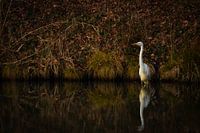 Ein ruhiges Porträt eines Silberreihers, perfekt gespiegelt im spiegelglatten Wasser. Die warmen Herbsttöne des Hintergrunds bilden einen wunderschönen Kontrast zum strahlend weißen Gefieder. Ein Bild, das Ruhe und natürliche Ausgeglichenheit ausstrahlt, ideal für ein modernes Interieur.