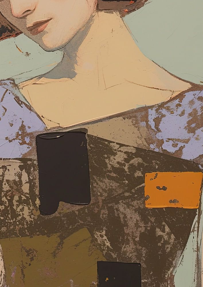 Serenity in Industrial Shades - Dieses Frauenbild zeigt eine heitere junge Frau mit einem komplexen Muster aus rostbraunen und gräulichen Flächen, die ihre Kleidung und ihren Hintergrund in Harmonie mit sanften Pastellfarben gestalten, in einem Stil, der an urbane Industriekunst erinnert.