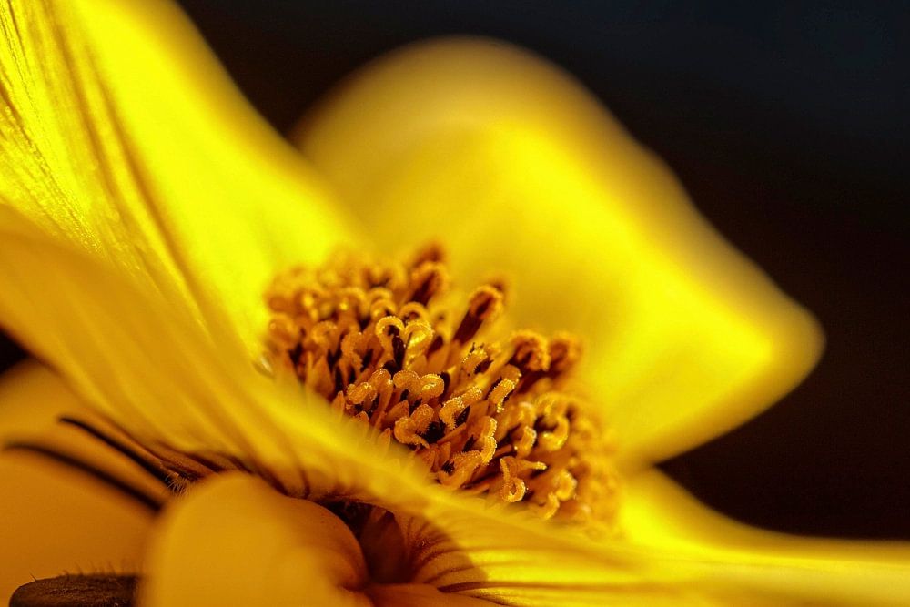 Nahaufnahme der gelben Coreopsis-Blüte in der Seitenansicht.