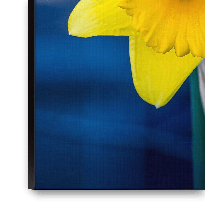Bestelle dieses Blumen-Wandbild Gelbe Narzisse mit blauem Hintergrund von Jeroen als Reproduktion auf Leinwand, Alu-Dibond, als Poster, Fototapete oder Acrylglasbild.