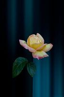 Ein Makrobild einer gelben Rose im Rivierenhof mit einem blau-schwarzen Fantasie-Hintergrund.