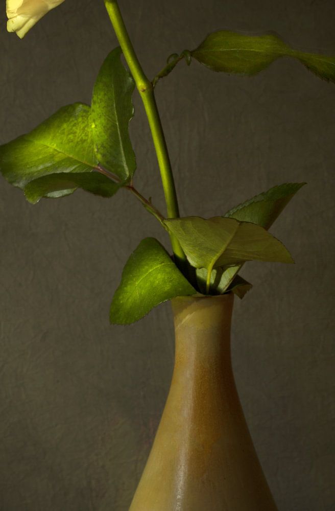 Die elegante Form der Vase verlangt nach einer schönen Blume. Es wurde diese gelbe Rose. Gemeinsam strahlen sie eine große Vertrautheit aus, als wären sie schon immer zusammen gewesen.